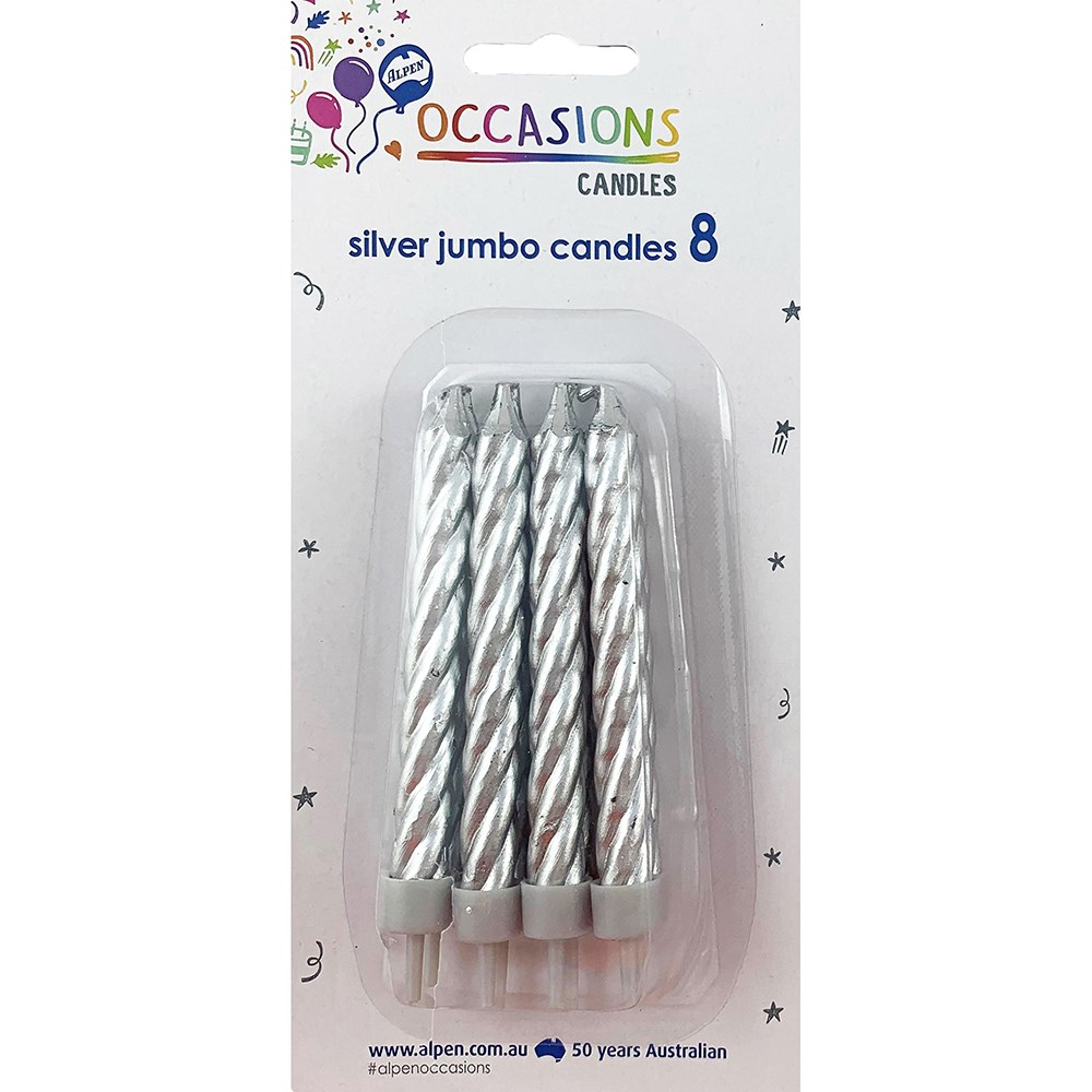 Alpen Occasions Jumbo Birthday Candles With Holders Spiral Silver Pack Of 8