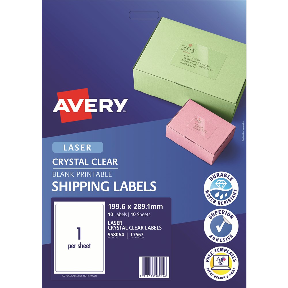 Software Code: L7567. Premium glossy clear material is with superior adhesive. Virtually disappear when applied to white and coloured surfaces. These labels feature Jam-Free technology for reliable trouble free printing, saving you time and minimising waste. Ideal for envelopes, letters and product labelling. Made in Australia.