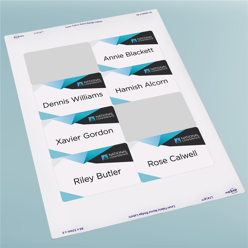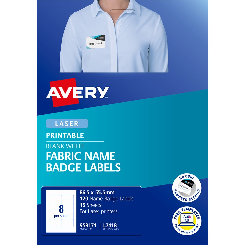 Ideal for seminars, meetings, trade fairs, conferencing, training sessions, schools and childcare centres. Fabric material is made from flexible acetate silk, can be used on most textiles and removed without leaving residue. Label will move with the clothing, without curling or peeling. Jam Freeâ„¢ reliability for trouble free printing on laser labels. Keep your facility safer by creating name badges on demand for employees and visitors Customise your labels with Avery Design and Print, available at averyproducts.com.au/print. Size: 86.5x55.5mm 120 labels, 15 sheets. 8 labels per sheet (8UP).
