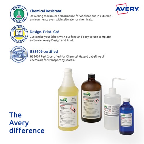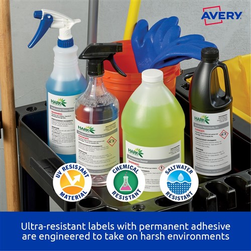 Ultra-Resistant Labels are saltwater resistant and certified for GHS Chemical Labelling with permanent adhesive and engineered to take on harsh environments. Unaffected by temperature variations -40?C to +150?C. Ideal for chemical labelling requirements and for onsite chemical decanting. Used in marine and harsh environments, ideal for safety signs, arc flash and tanks. Customise your labels with Avery Design and Print, available at averyproducts.com.au/print. Size: 208x295mm 10 labels, 10 sheets. 1 label per sheet (1UP).