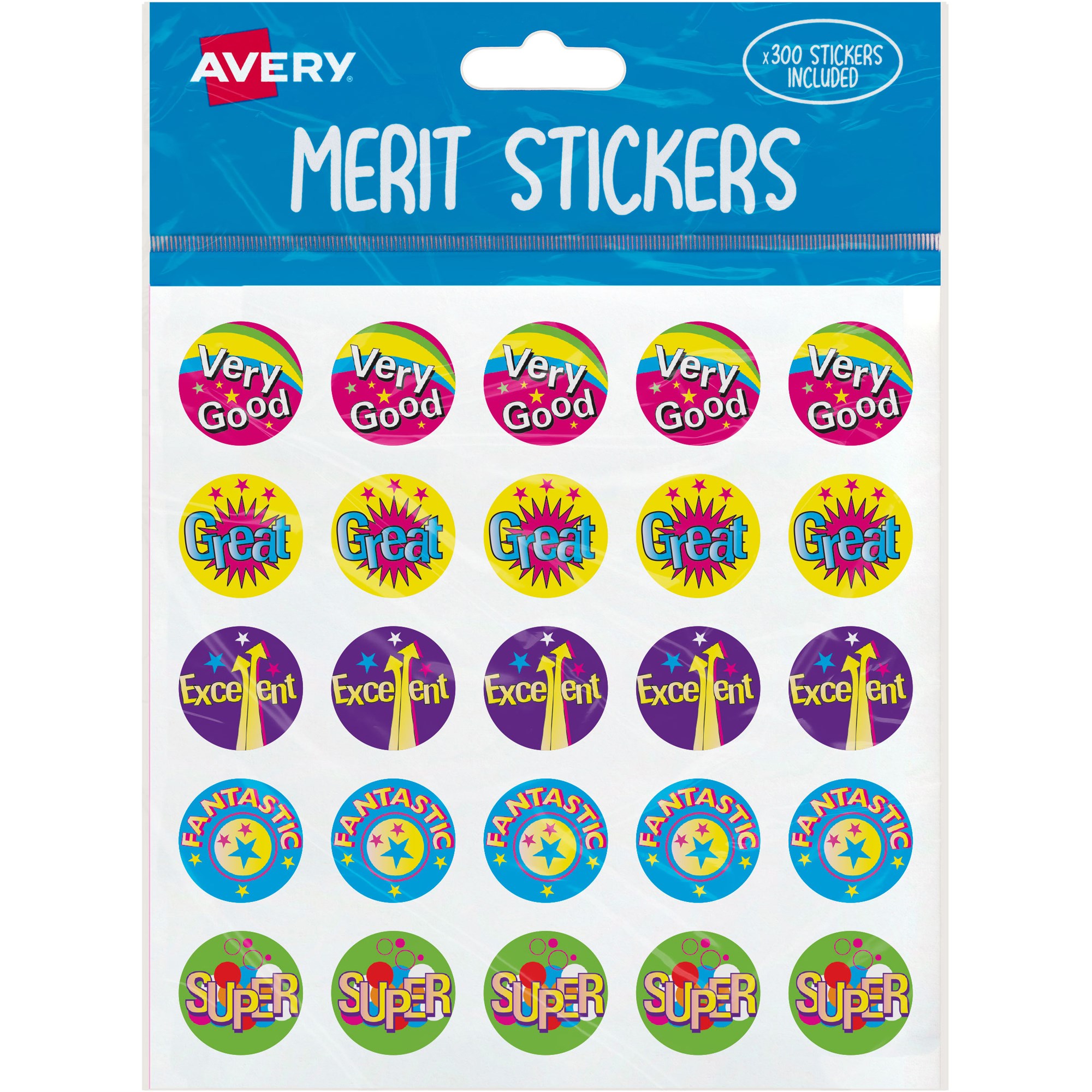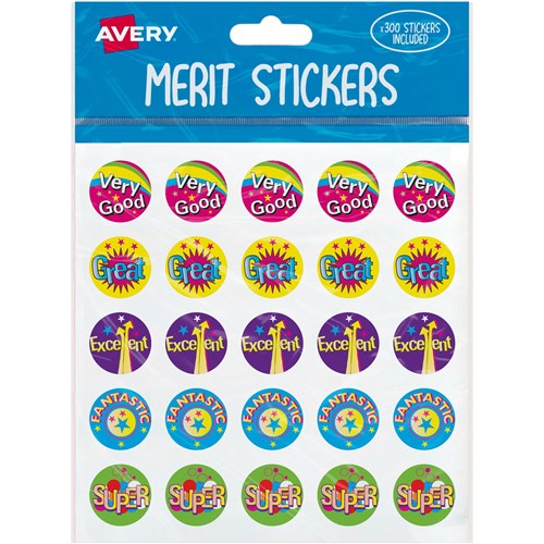 Avery Merit Stickers Caption 1 Round 22mm 5 Designs Assorted Colours 300 Stickers