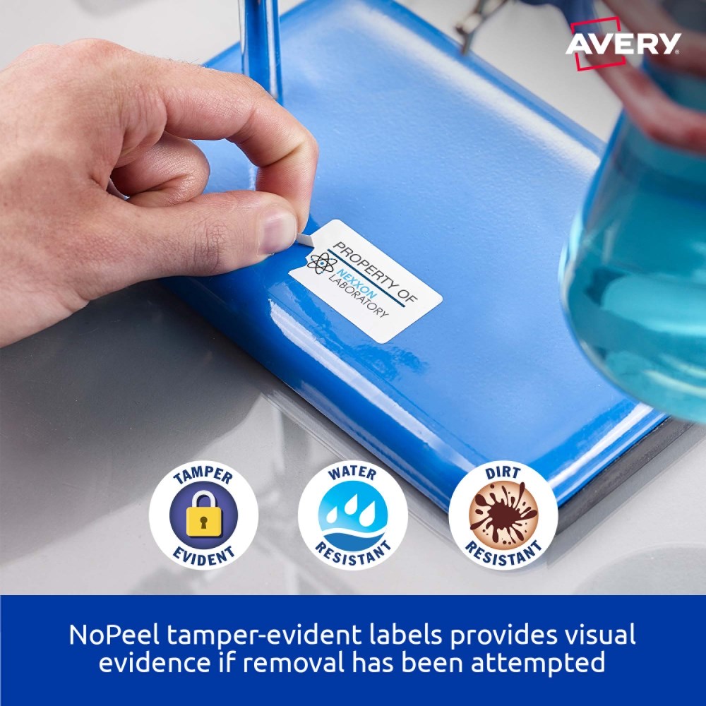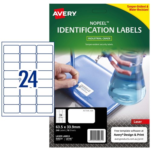 Tamper-evident security solution. If an attempt has been made to remove the label the material flakes and disintegrates, making removal virtually impossible and tampering immediately obvious. Durable labels are tear proof, water, dirt, oil and UV resistant. Unaffected by temperature variations -40°C to +100°C. Applications: for permanent tamper-evident asset labelling for computers, laptops, tablets, smartphones, computer screens, office equipment, tools and machinery. Customise your labels with Avery Design and Print, available at averyproducts.com.au/print. Size: 63.5x33.9mm 240 labels, 10 sheets. 24 labels per sheet (24UP).