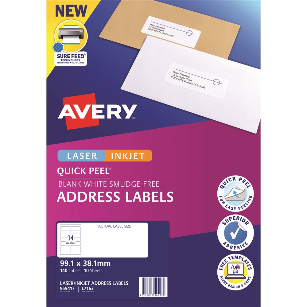 Avery Quick Peel Address Laser & Inkjet Labels White L7163 99.1 x 38mm 14UP 140 Labels
