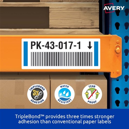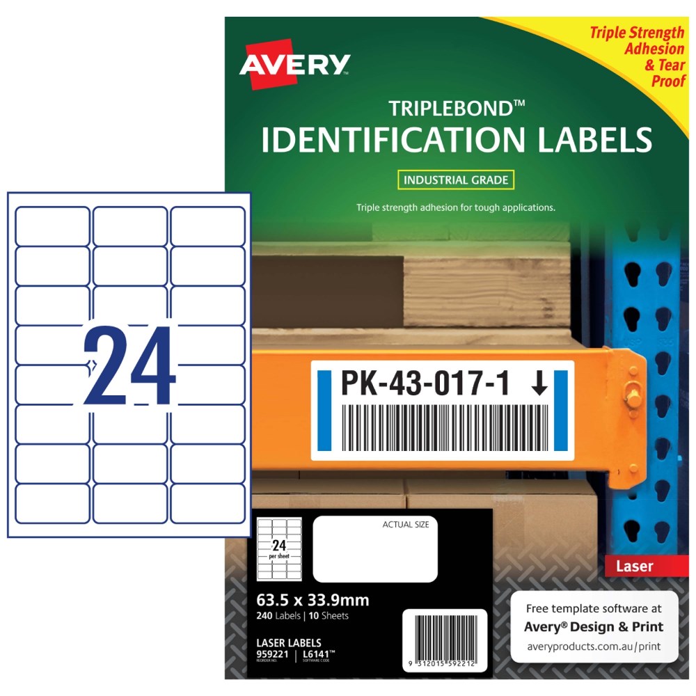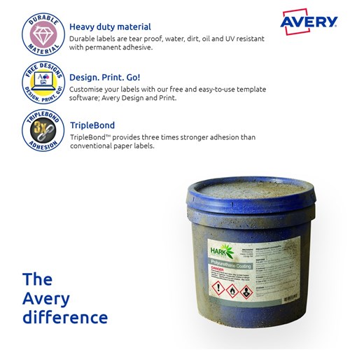 Three times stronger for tough outdoor applications. Tough labels engineered for permanent identification. Durable labels which are oil and dirt resistant, water resistant and tear-proof. Unaffected by temperature variations -40°C to +100°C. Applications: ideal for outdoor applications. For permanent identification for warehouse pallets, racking, machinery and equipment. Identifying outdoor scaffolding, pallet racking, drums, containers, storage cabinets, portable floor stands and barriers. Customise your labels with Avery Design and Print, available at averyproducts.com.au/print. Size: 63.5x33.9mm 240 labels, 10 sheets. 24 labels per sheet (24UP).