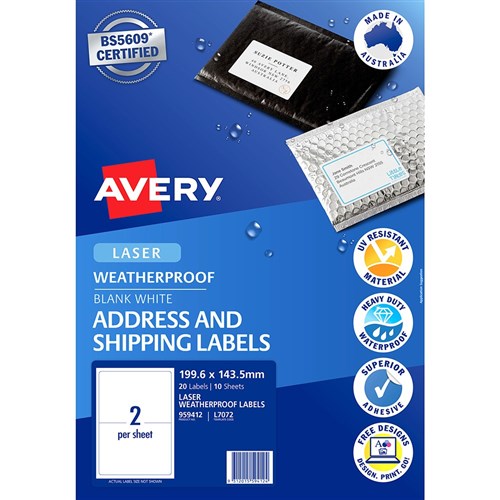 Durable water-resistant labels provide strong protection against harsh elements. UV-resistant, water-resistant and weatherproof. Customise your labels with Avery Design and Print, available at averyproducts.com.au/print. Perfect for shipping, addressing, priority messages, warning labels and more. Made in Australia. Size: 199.6x143.5mm 20 labels, 10 sheets. 2 labels per sheet (2UP).