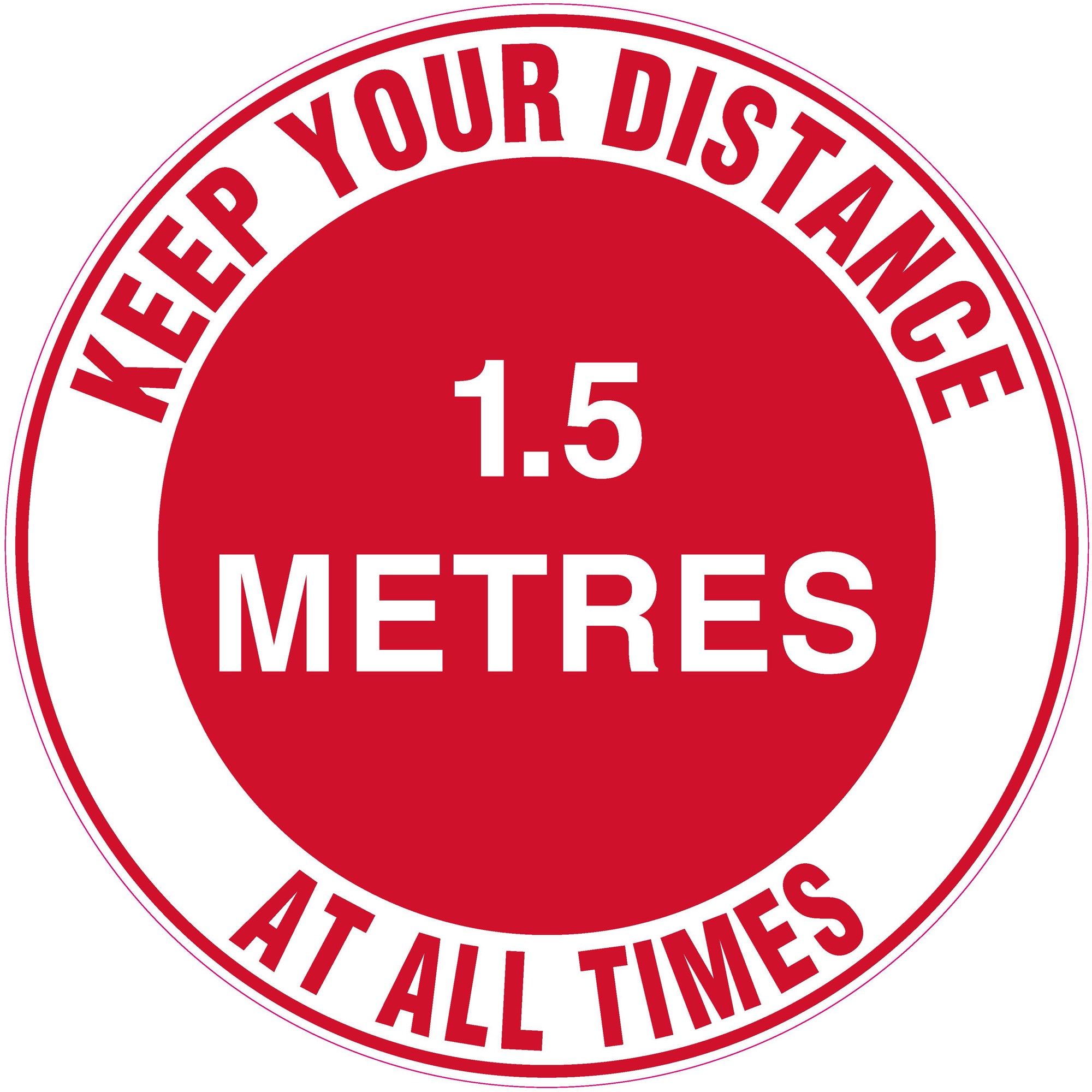 Wording: Keep Your Distance 1.5 Metres At All Times. Self-adhesive walk-on floor sign designed to bond to many different surfaces. Self adhesive vinyl with protective over laminate. Suitable for heavy traffic areas or wall mounting applications where graffiti or heavy wash downs are a problem. Easy to remove, just peel off the marker and wipe down the surface area. Suitable for internal use. Size: 440mm diameter.