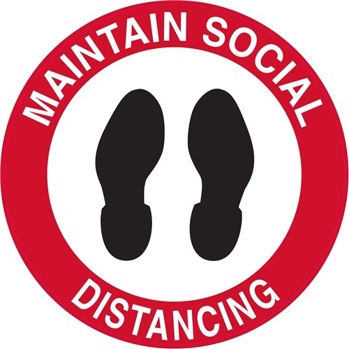 Wording: Maintain Social Distancing (with footprint picto). Self-adhesive walk-on floor sign designed to bond to many different surfaces. Clear textured overlaminate protects warning message. Easy to remove, just peel off the marker and wipe down the surface area. Suitable for internal use. Size: 440mm diameter.