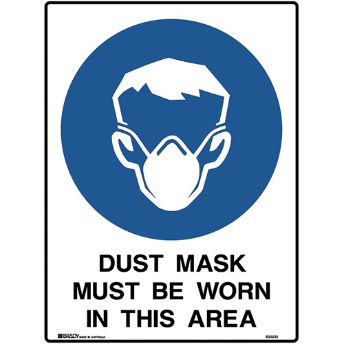 Wording: Dust Mask Must Be Worn In This Area. Material: Polypropylene. Mandatory signs specify an instruction that must be carried out. Complies with AS 1319. Available in various materials and sizes. Size: 450W x 600mmH.