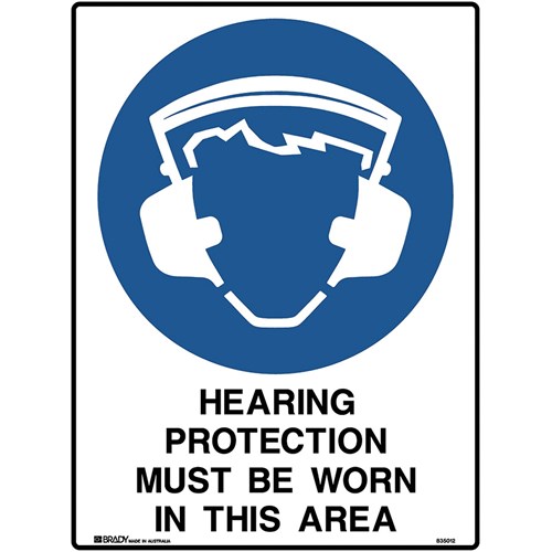 Wording: Hearing Protection Must Be Worn In This Area. Material: Polypropylene. Mandatory signs specify an instruction that must be carried out. Complies with AS 1319. Available in various materials and sizes. Size: 450W x 600mmH.
