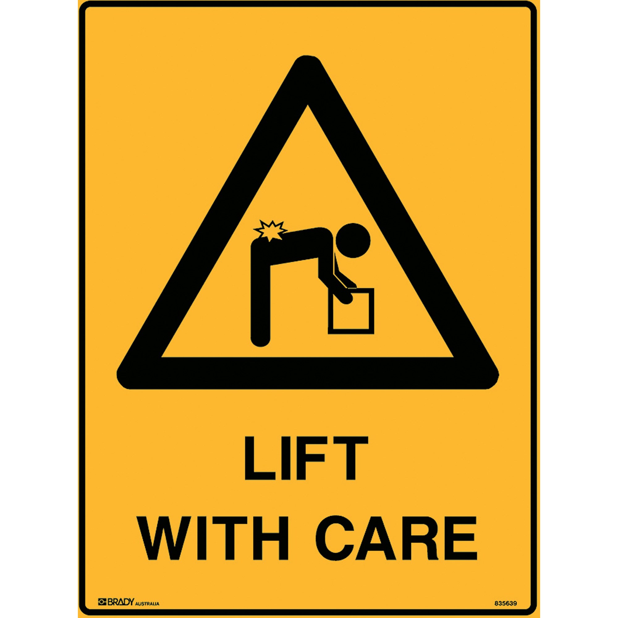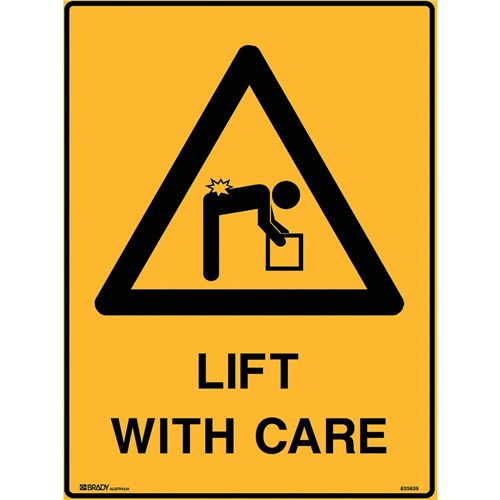 Brady Warning Sign Lift With Care 450W x 600mmH Polypropylene Yellow And Black