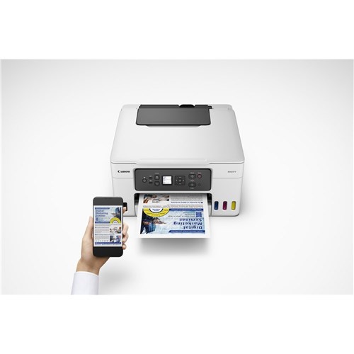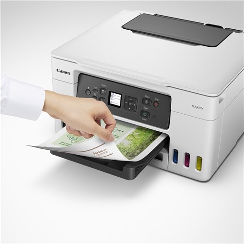 Print, copy and scan. Print Resolution: 600 (horizontal) x 1200 (vertical) dpi. Document Print Speed: 13ipm (colour) 18ipm (black and white). Paper Capacity: Cassette: plain paper = 250, Rear Tray: Plain paper = 100, Photo paper 4 x 6 inch = 20. Connectivity: Wireless 2.4GHz & 5GHz, Wireless Direct, Wired LAN, Mobile, USB-B Port. Display: 3.4cm LCD (Monochrome). Flatbed scanner. 1200x 2400 dpi. Wireless connectivity for wireless printing, and mobile printing via the Canon PRINT app. Compatible Ink: GI-66 ink series. Maintenance Cartridge: MC-G03. Dimensions: 399W x 417D x 216mmH. 2 Year Manufacturer's Warranty.