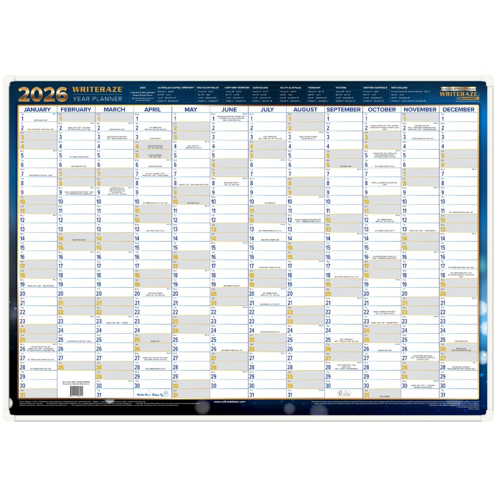 Laminated planner for write on/wipe off applications, supplied with quality dry erase marker, marker clip and adhesive mounting blocks. Includes all Australian holidays and important dates, with shaded weekends for easy weekly planning. Size: 500 x 700mm. FSC Certified.