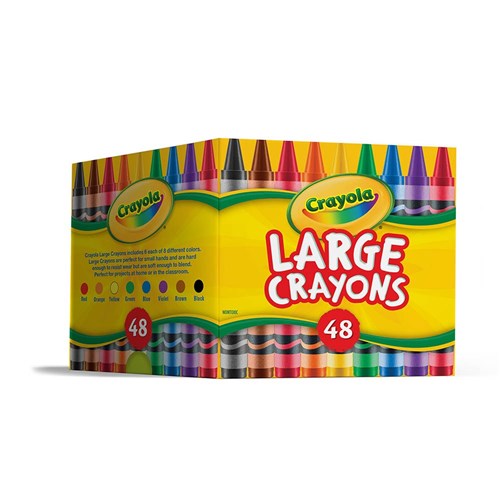 48 large crayons. 11mm x 101mm length. 8 different brilliant colours. Soft enough to blend, hard enough to resist wear. Colourful reusable and recyclable desk caddy. Simply remove the hood to create a share pack to be used in the middle of the table in a classroom or great for the art table at home. This share pack has all the large crayons children need to draw, colour, and create.