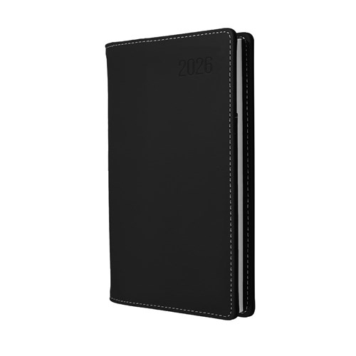 Soft-touch padded cover. Lay flat wiro binding with ribbon marker. Document pocket and business card sleeve. No appointment times. Australian and New Zealand holidays. 3 year calendars. Current and forward year planners. International holidays, dialling and time zones. Staff Leave planner. Addresses and notes. Size: 176 x 88mm. FSC Certified.