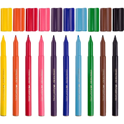 Classpack of 100 Connector felt tip pens in 10 brilliant vibrant colours Comes in a handy bucket with a handle for easy storage and packing Bullet-shaped durable felt-nibs create consistent, precise lines Connectable caps keep pens organised and inspire play and building Water-based ink is non-toxic and safe for kids Washes out of most fabrics for peace of mind and easy clean-up Breathable non-choke caps ensure worry-free playtime Long-lasting ink means fewer pen replacements