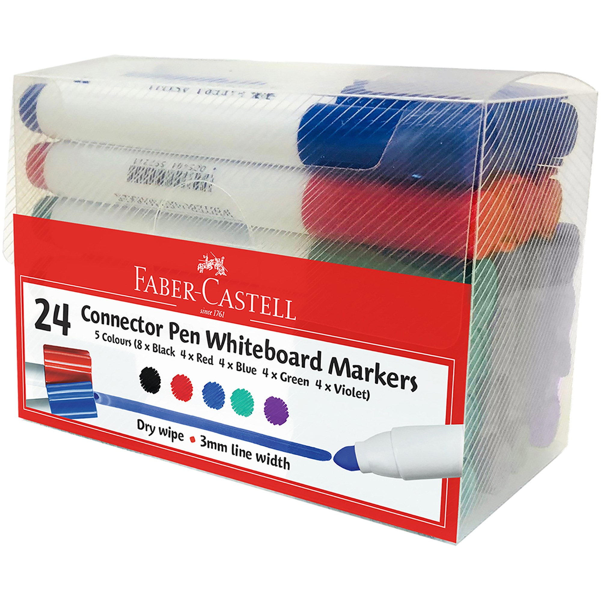 24 Whiteboard Markers in an assortment of bright, vibrant colours (8 Black, 4 Red, 4 Green, 4 Blue, 4 Violet) Big 3mm Bullet tips for better line visibility on large boards Ink effortlessly dry-erases for easy, residue-free clean-up Durable felt-nibs create consistent, precise lines Long-lasting ink means fewer marker replacements Whiteboard ink is safe and non-toxic for peac of mind 100 hour cap-off time reduces stress over lost lids Convenient connector caps allow for quick and easy storage