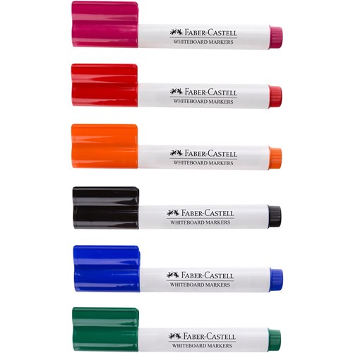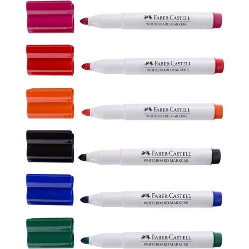 6 bright, vibrant colours in Red, Pink, Orange, Green, Blue and Black Big 3mm Bullet tips for better line visibility on large boards Ink effortlessly dry-erases for easy, residue-free clean-up Durable felt-nibs create consistent, precise lines Long-lasting ink means fewer marker replacements Whiteboard ink is safe and non-toxic for peac of mind 100 hour cap-off time reduces stress over lost lids Convenient connector caps allow for quick and easy storage