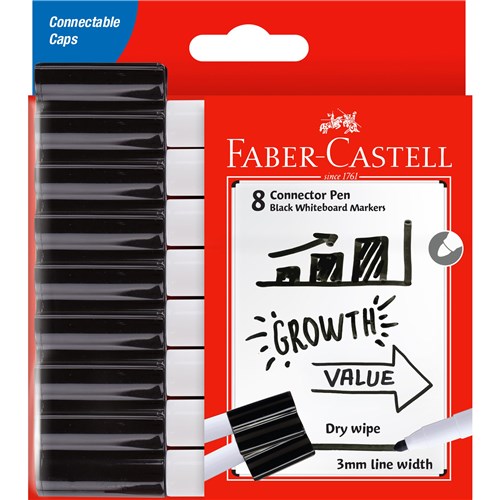 Includes 8 BLACK ONLY Faber-Castell Connector Pen Whiteboard Markers Big 3mm Bullet tips for better line visibility on large boards Convenient connector caps allow for quick and easy storage Bright, vibrant colours help to organise big ideas Ink effortlessly dr-erases for easy, residue-free clean-up Durable felt-nibs create consistent, precise lines Long-lasting ink means fewer marker replacements Whiteboard ink is safe and non-toxic for peace of mind 100 hour super cap off time