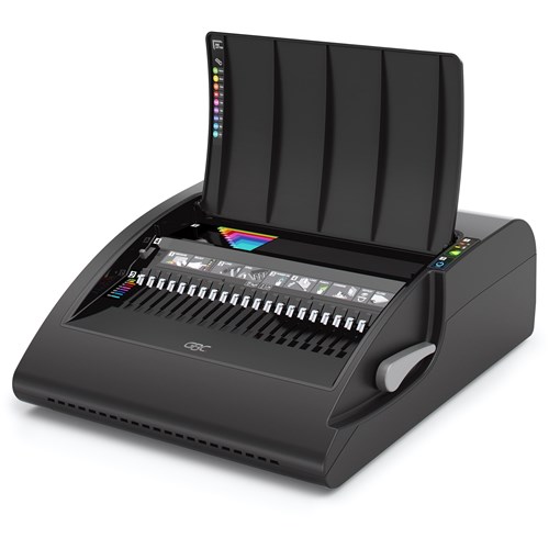 Binding capacity of 450 80gsm sheets. Punches 20 80gsm sheets of paper. One touch electric punch makes the binding process even easier. Quickstep work flow guide for simple and intuitive operation. Designed for moderate/heavy use. Simultaneous punch bind. 2 Year Manufacturer's Warranty.