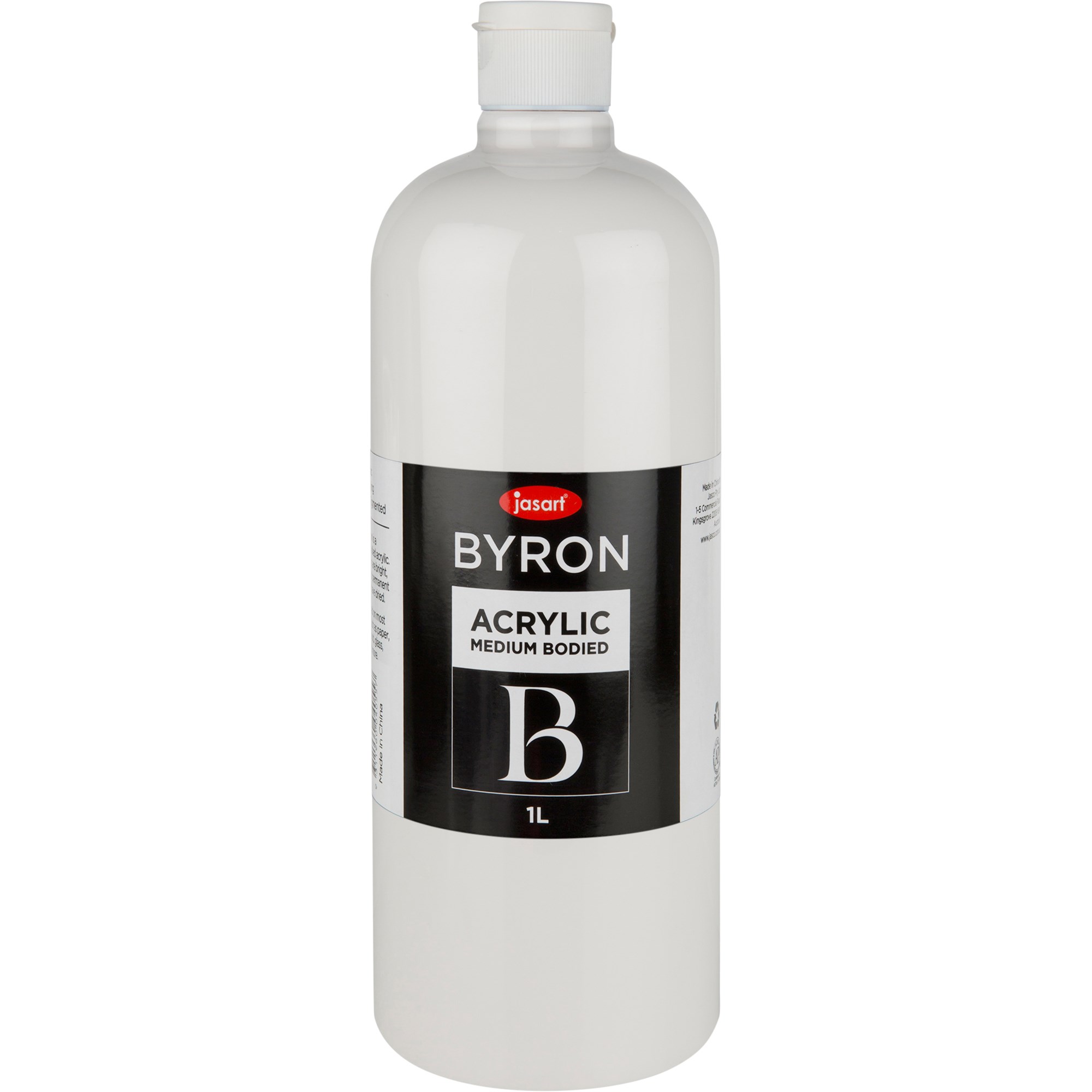 Jasart Byron is a medium bodied acrylic The colours are bright, intense and permanent after they have dried Can be used on most surfaces such as paper, canvas, wood, glass, plastic and more Warm and Cool Primary colours will allow you to have a superior colour mixing Non toxic 75ml tubes available in 30 colours including 4 fluoro colours and 2 metallic colours Each individual tube is foil sealed Also available in 1 Litre bottles in 23 colours including 2 metallic colours.