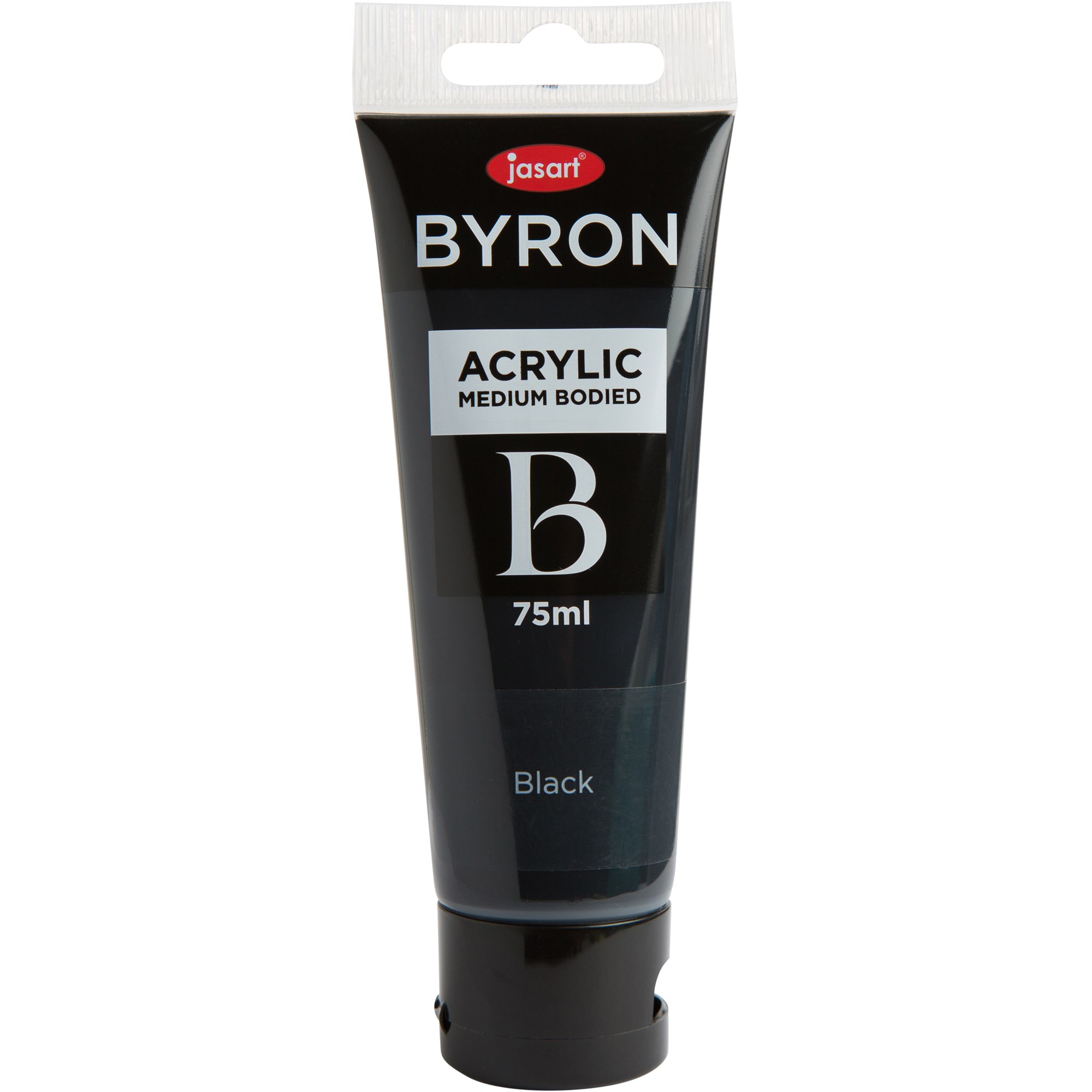 Jasart Byron is a medium bodied acrylic The colours are bright, intense and permanent after they have dried Can be used on most surfaces such as paper, canvas, wood, glass, plastic and more Warm and Cool Primary colours will allow you to have a superior colour mixing Non toxic 75ml tubes available in 30 colours including 4 fluoro colours and 2 metallic colours Each individual tube is foil sealed Also available in 1 Litre bottles in 23 colours including 2 metallic colours.