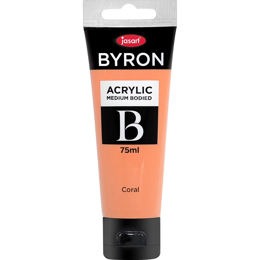 Jasart Byron is a medium bodied acrylic The colours are bright, intense and permanent after they have dried Can be used on most surfaces such as paper, canvas, wood, glass, plastic and more Warm and Cool Primary colours will allow you to have a superior colour mixing Non toxic 75ml tubes available in 30 colours including 4 fluoro colours and 2 metallic colours Each individual tube is foil sealed Also available in 1 Litre bottles in 23 colours including 2 metallic colours.