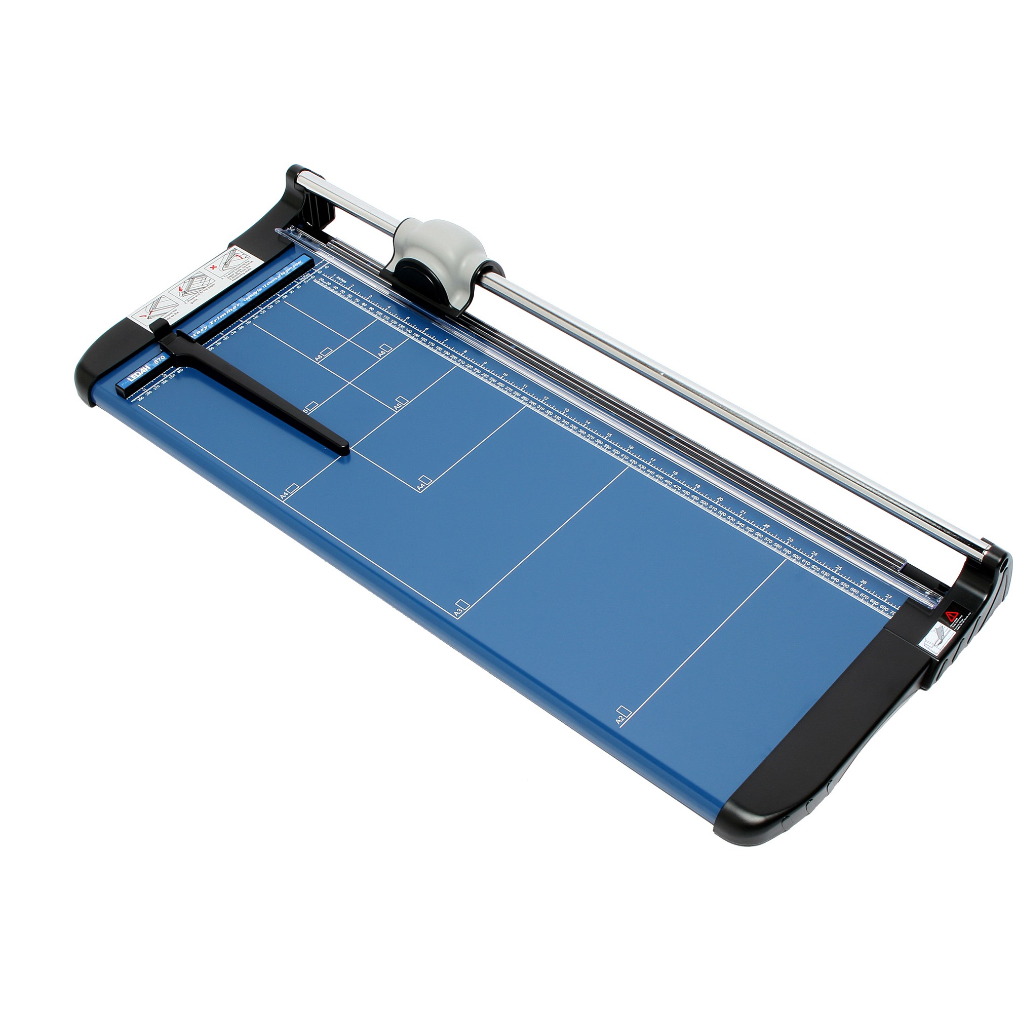 Strong and sturdy solid metal cutting base Ergonomic replaceable cutting head with self-sharpening rotary blade Transparent hand guard clamps on to paper while cutting Adjustable paper guide, Scale marking with DIN paper sizes Wall mountable for easy storage A2 size cuts up to 12 sheets (80gsm paper)