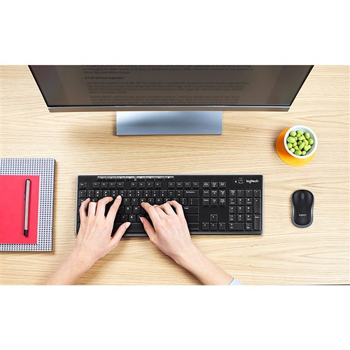 MK270 Wireless Combo brings together the convenience and comfort of a full-sized keyboard with a sculpted, compact mouse. With media keys, a number pad and precise cursor control to make your work a whole lot smoother. A simple plug-and-play USB receiver offers a strong 2.4 GHz wireless connection with 10 meters of range. This full-size wireless keyboard features a spill-resistant design (Max 60 millilitres liquid spillage), durable keys and sturdy tilt legs with adjustable height. Features a 36 month keyboard and 12 month mouse battery life. Batteries Included - 2 AAA (Keyboard) and 1 AA (Mouse). 49% post-consumer recycled material (mouse) and 54% post-consumer recycled material (keyboard). Certified carbon neutral. 3 Years Manufacturer's Warranty.