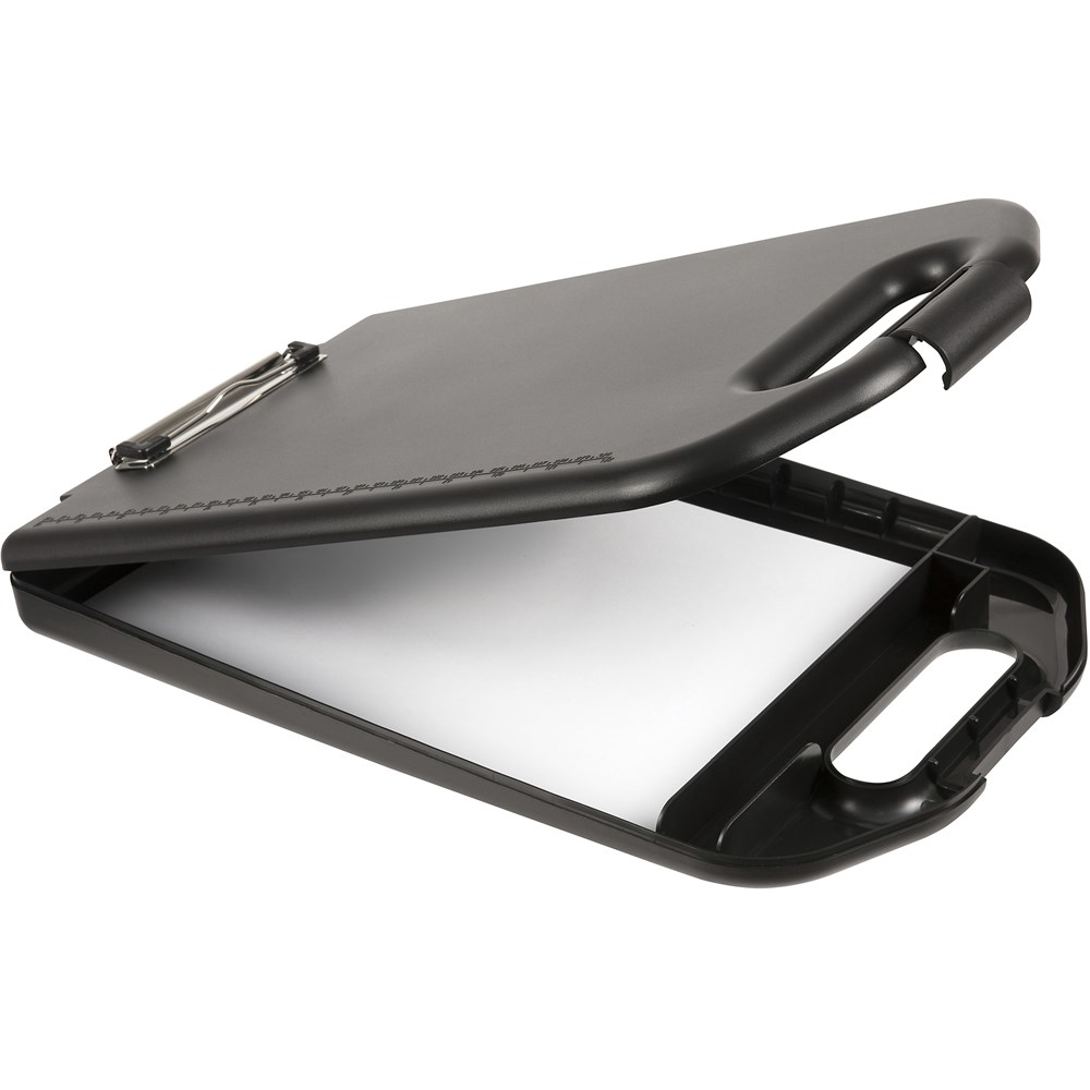 Handy mobile storage clipboard. Ideal for warehouse and office use. Includes a large capacity internal storage section ideal for notepads and pens. Portable, perfect for those on the go. Wire clip keeps documents secure. Durable hard plastic ensures a sturdy writing area. Internal measurements: 230W x 320L x 27mmH. Comes with an internal pressure clip to keep documents secure inside.