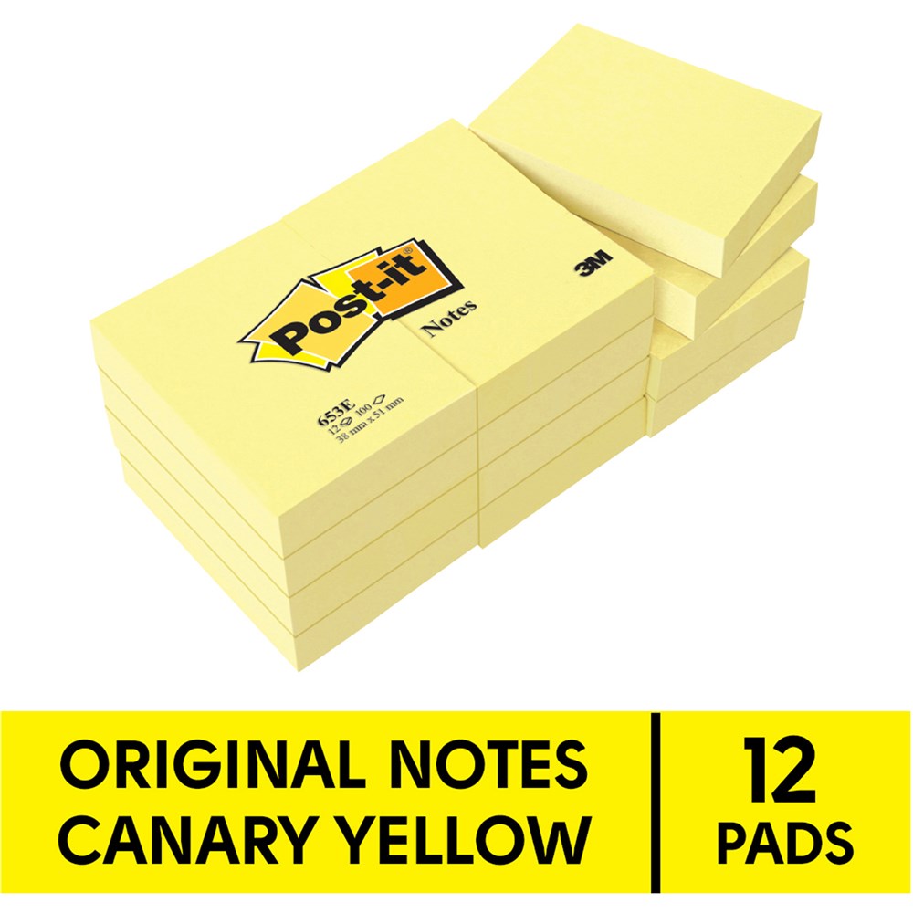 Post-It 653 Notes Original 38 x 50mm Yellow Pad 100 Sheets Pack of 12