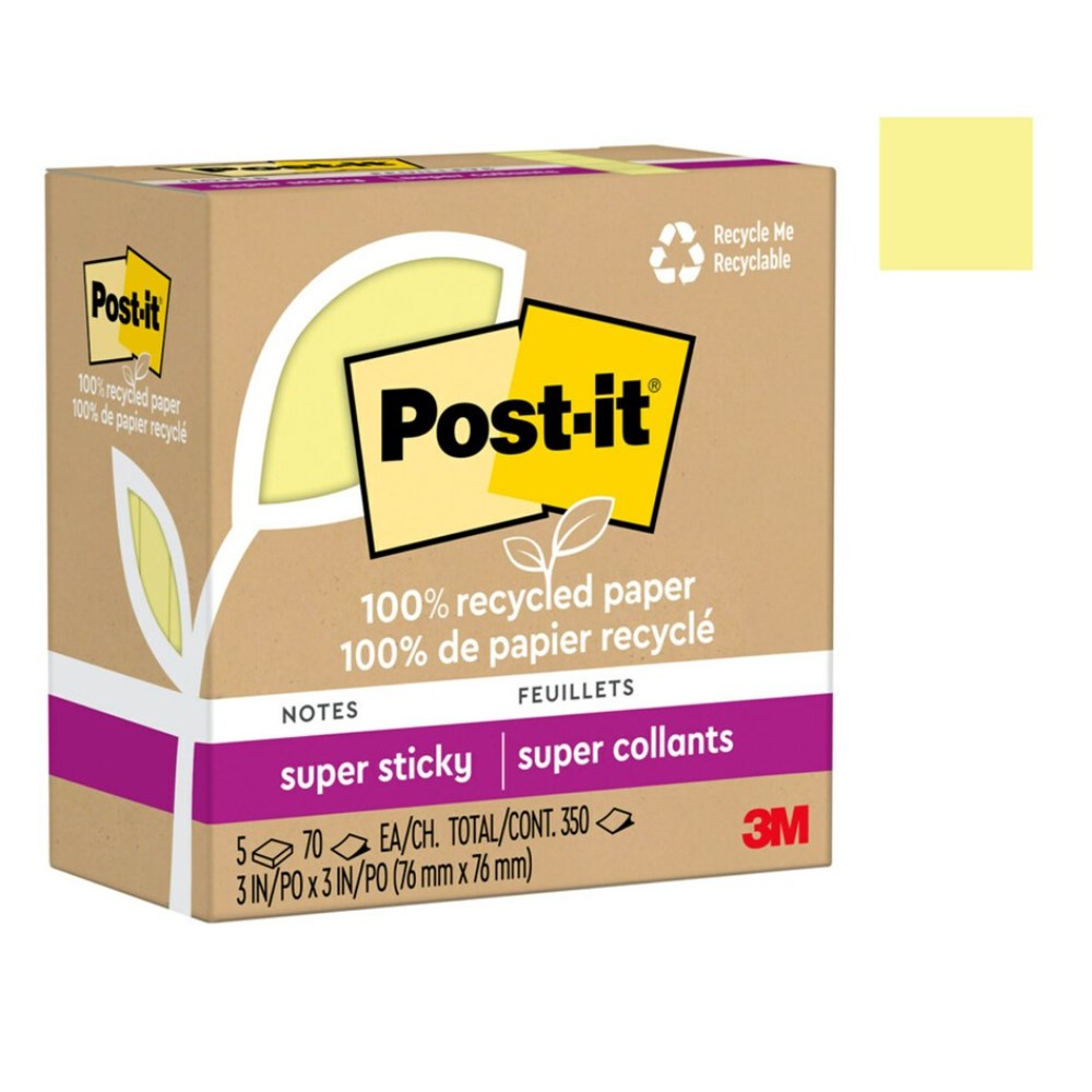 Post-It 654R-5SSCY Super Sticky Notes Recycled 76mm x 76mm Yellow Pack Of 5