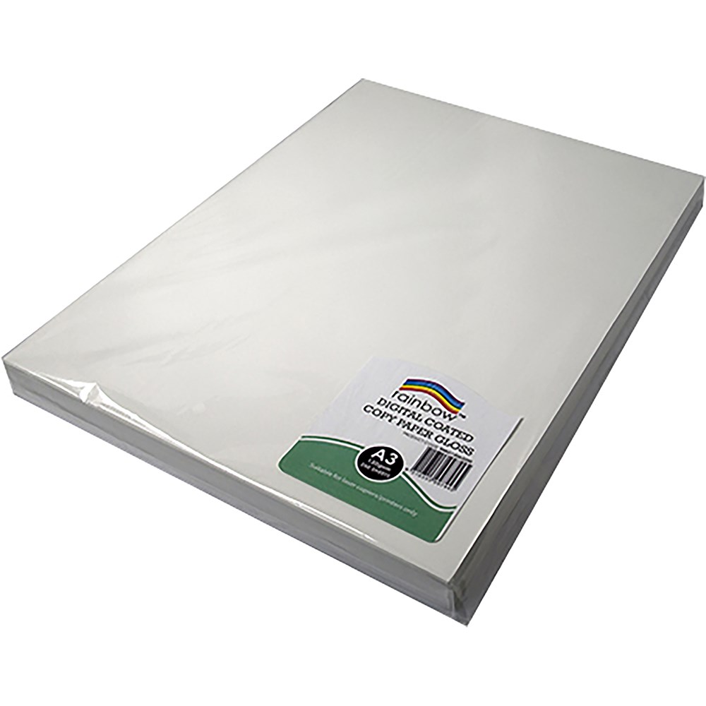 Rainbow Gloss paper is available in A3 and A4 sizes and an array of weights. Suitable for high speed and laser printers. FSC Certified. Acid Free. Also available in box of 3 packs.