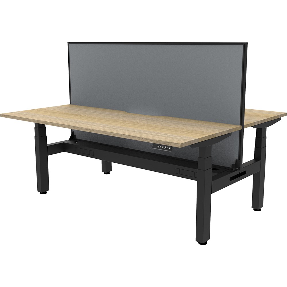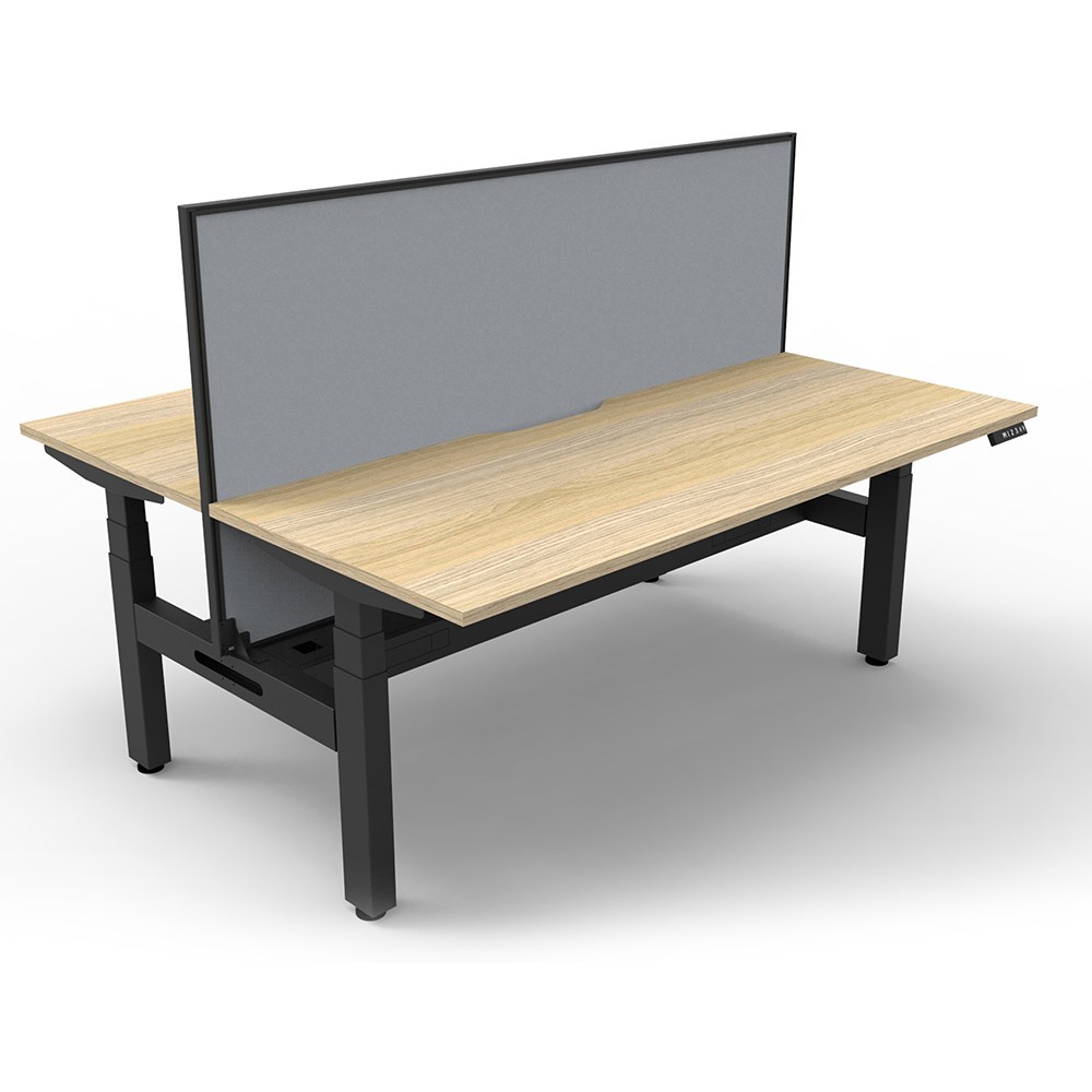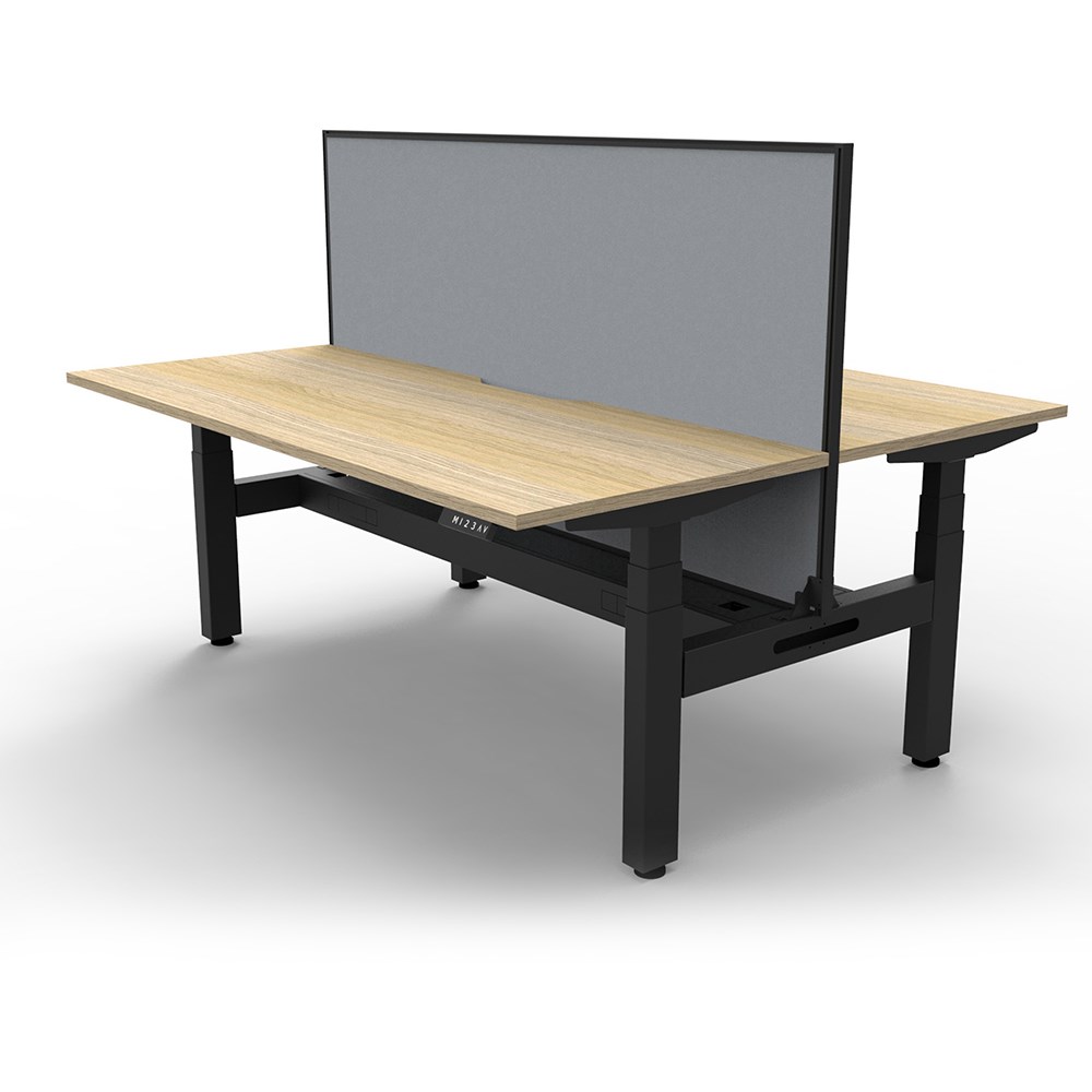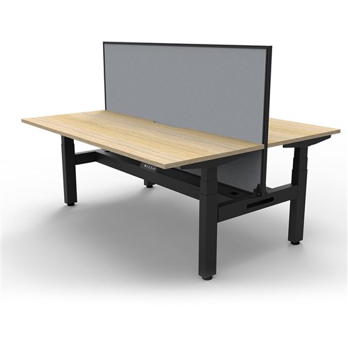 The entire Boost+ range has now been performance tested and is compliant to the AFRDI standards for general safety, strength, durability and stability in all sizes and configurations based on AS/NZS 4442:201. Unit Dimension: 1500mm W x 1500mm D x 1330mm H (Overall). Per User: 1500mm W x 750mm D. Desk Height: 620-1270mm H. Includes pinnable privacy screen in grey fabric with matching black powder coated frame. 900mm H x 30mm T. Smooth and quiet adjustment at 38mm per second. Min Digital control panel with 3 pre-set positions, LED display panel, keypad safety lock and reminder alarm setting. Natural Oak coloured worksurface with 750mm depth top. 50mm D scallop cut out to rear. Back to Back Workstation with Screen and Cable Tray. Dual motor 3 stage motorised legs. 140kg weight loading capacity. 10 Year Manufacturer's Warranty. Delivery, installation and assembly charges may apply to furniture. Please enquire to confirm.