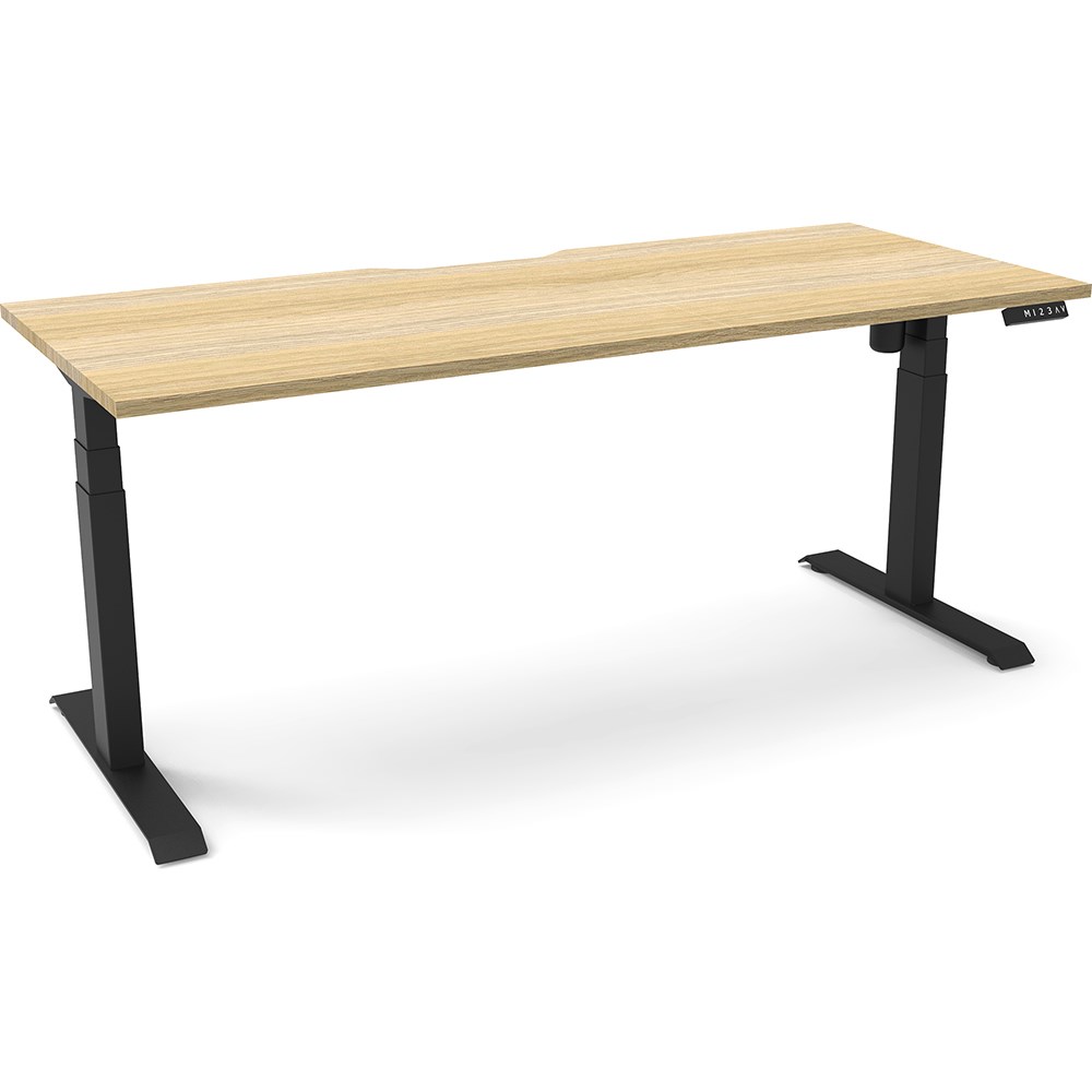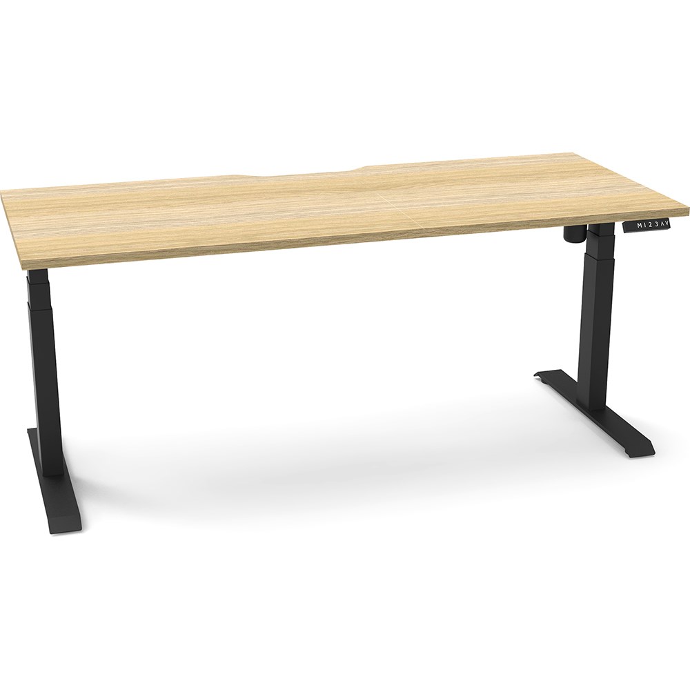 Natural Oak top with Black frame. Unit Dimension: 1800mm W x 750mm D x 620-1270mm H. E0 rated top. Powdercoat base. Digital control panel with 3 pre-set positions, LED display panel, keypad safety lock & reminder alarm setting. Anti-collision technology, noise emission of less than 50DB. Lifting capacity of 80kg with a max speed of 25mm per second. 700mm wide foot size with adjustable leveling feet. 10 Year Manufacturer's Warranty. Delivery, installation and assembly charges may apply to furniture. Please enquire to confirm.