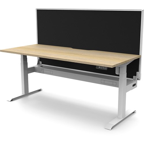 Natural Oak top with White frame. Unit Dimension: 1200mm W x 750mm D x 1330mm H. 620-1270mm height range for desk. E0 rated top. Powdercoat base. Digital control panel with 3 pre-set positions, LED display panel, keypad safety lock & reminder alarm setting. Anti-collision technology, noise emission of less than 50DB. Lifting capacity of 80kg with a max speed of 25mm per second. 700mm wide foot size with adjustable leveling feet. Comes with 30mm thick privacy screens and cable tray for cable management. 10 Year Manufacturer's Warranty. Delivery, installation and assembly charges may apply to furniture. Please enquire to confirm.