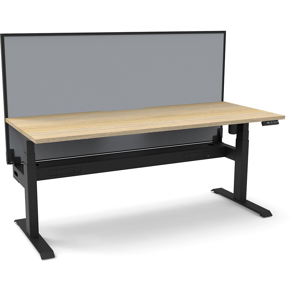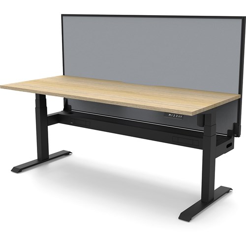 Natural Oak top with Black frame. Unit Dimension: 1500mm W x 750mm D x 1330mm H. 620-1270mm height range for desk. E0 rated top. Powdercoat base. Digital control panel with 3 pre-set positions, LED display panel, keypad safety lock & reminder alarm setting. Anti-collision technology, noise emission of less than 50DB. Lifting capacity of 80kg with a max speed of 25mm per second. 700mm wide foot size with adjustable leveling feet. Comes with 30mm thick privacy screens and cable tray for cable management. 10 Year Manufacturer's Warranty. Delivery, installation and assembly charges may apply to furniture. Please enquire to confirm.
