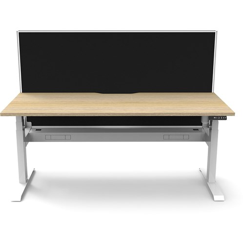 Natural Oak top with White frame. Unit Dimension: 1500mm W x 750mm D x 1330mm H. 620-1270mm height range for desk. E0 rated top. Powdercoat base. Digital control panel with 3 pre-set positions, LED display panel, keypad safety lock & reminder alarm setting. Anti-collision technology, noise emission of less than 50DB. Lifting capacity of 80kg with a max speed of 25mm per second. 700mm wide foot size with adjustable leveling feet. Comes with 30mm thick privacy screens and cable tray for cable management. 10 Year Manufacturer's Warranty. Delivery, installation and assembly charges may apply to furniture. Please enquire to confirm.