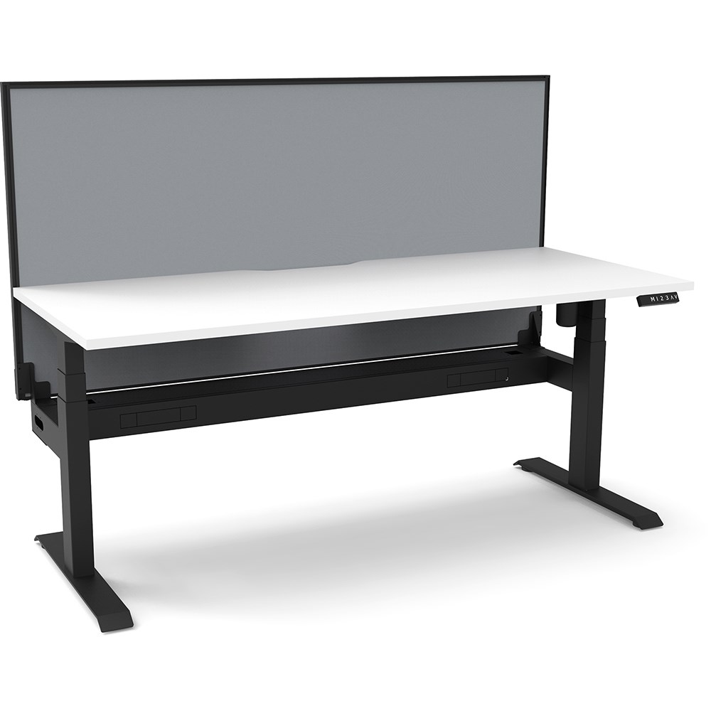 White top with Black frame. Unit Dimension: 1500mm W x 750mm D x 1330mm H. 620-1270mm height range for desk. E0 rated top. Powdercoat base. Digital control panel with 3 pre-set positions, LED display panel, keypad safety lock & reminder alarm setting. Anti-collision technology, noise emission of less than 50DB. Lifting capacity of 80kg with a max speed of 25mm per second. 700mm wide foot size with adjustable leveling feet. Comes with 30mm thick privacy screens and cable tray for cable management. 10 Year Manufacturer's Warranty. Delivery, installation and assembly charges may apply to furniture. Please enquire to confirm.