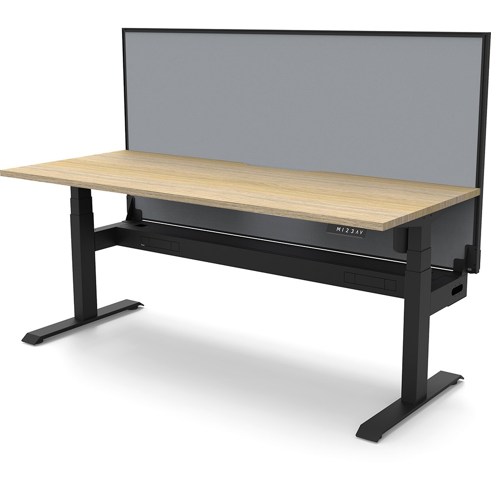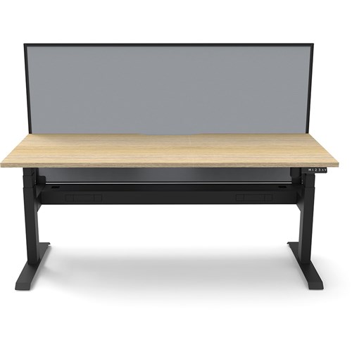 Natural Oak top with Black frame. Unit Dimension: 1800mm W x 750mm D x 1330mm H. 620-1270mm height range for desk. E0 rated top. Powdercoat base. Digital control panel with 3 pre-set positions, LED display panel, keypad safety lock & reminder alarm setting. Anti-collision technology, noise emission of less than 50DB. Lifting capacity of 80kg with a max speed of 25mm per second. 700mm wide foot size with adjustable leveling feet. Comes with 30mm thick privacy screens and cable tray for cable management. 10 Year Manufacturer's Warranty. Delivery, installation and assembly charges may apply to furniture. Please enquire to confirm.