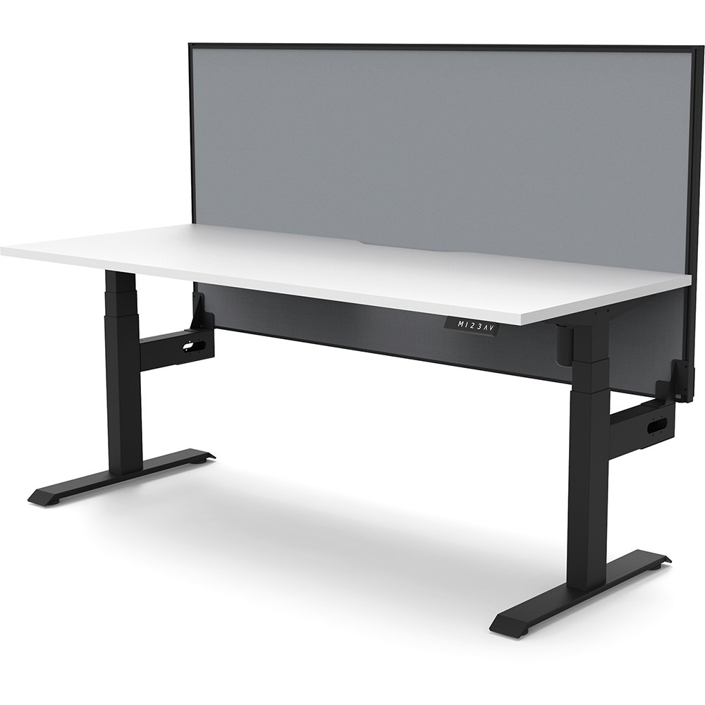 White top with Black frame. Unit Dimension: 1500mm W x 750mm D x 1330mm H. 620-1270mm height range for desk. E0 rated top. Powdercoat base. Digital control panel with 3 pre-set positions, LED display panel, keypad safety lock & reminder alarm setting. Anti-collision technology, noise emission of less than 50DB. Lifting capacity of 80kg with a max speed of 25mm per second. 700mm wide foot size with adjustable leveling feet. Comes with 30mm thick privacy screen. 10 Year Manufacturer's Warranty. Delivery, installation and assembly charges may apply to furniture. Please enquire to confirm.