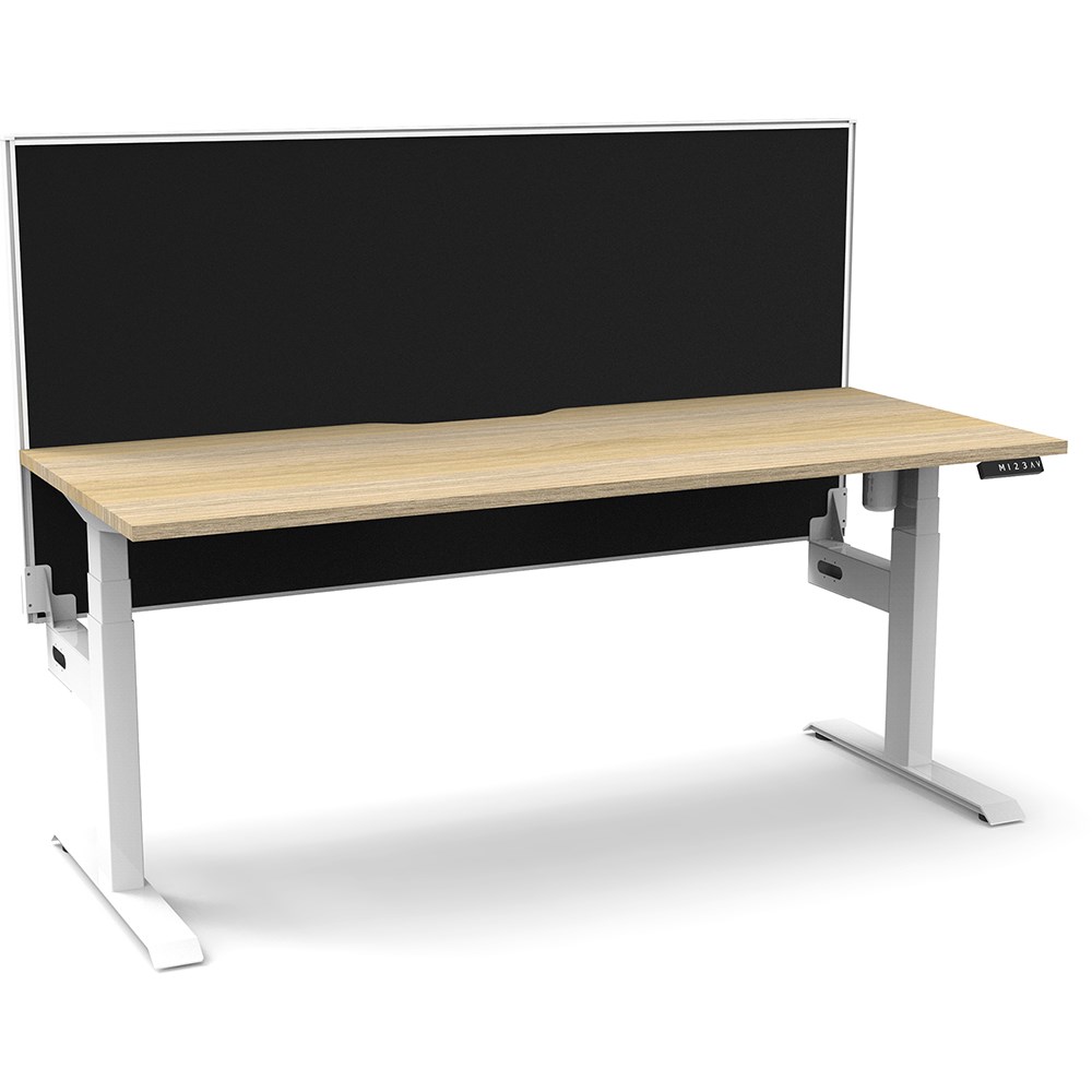 Natural Oak top with White frame. Unit Dimension: 1800mm W x 750mm D x 1330mm H. 620-1270mm height range for desk. E0 rated top. Powdercoat base. Digital control panel with 3 pre-set positions, LED display panel, keypad safety lock & reminder alarm setting. Anti-collision technology, noise emission of less than 50DB. Lifting capacity of 80kg with a max speed of 25mm per second. 700mm wide foot size with adjustable leveling feet. Comes with 30mm thick privacy screen. 10 Year Manufacturer's Warranty. Delivery, installation and assembly charges may apply to furniture. Please enquire to confirm.