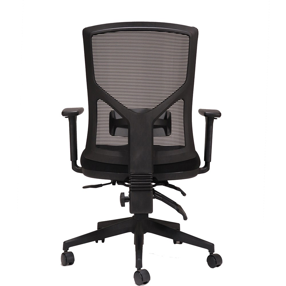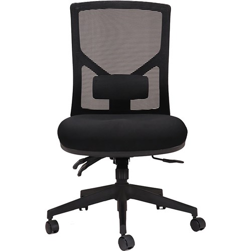 Black mesh back with black fabric seat pan. 680mm diameter black nylon 5 star spider base. Height adjustable lumbar support and manual back rest tensioner. 4 lever ergonomic mechanism with seat slide. AS/NZS4438 level 6 SGS certified. 3D adjustable arms sold separately. 10 Year Manufacturer's Warranty. Delivery, installation and assembly charges may apply to furniture. Please enquire to confirm.