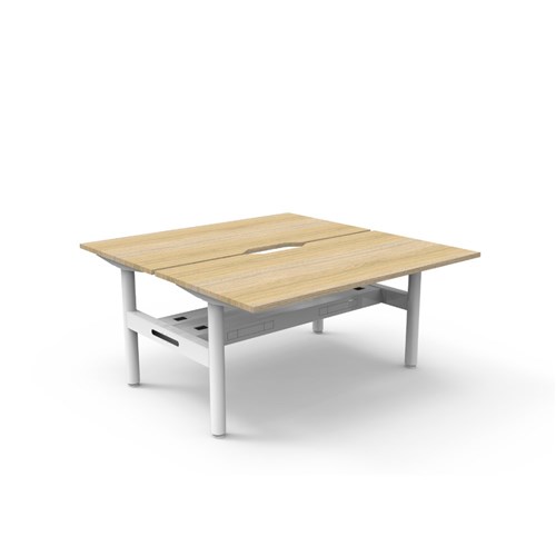 Natural Oak top White Satin frame. Double sided workstation with cable tray. Overall Dimensions: 1500mW x 1500D x 730mmH. Per User Dimensions: 1500W x 750D x 730mmH. E0 rated 25mm top with rigid edging and 50mm diameter scallop cut out to rear. Powder coated underframe. Adjustable levelling feet. Can be customised with optional accessories like cable management solutions and privacy screens. 10 Year Manufacturer's Warranty. Delivery, installation and assembly charges may apply to furniture. Please enquire to confirm.