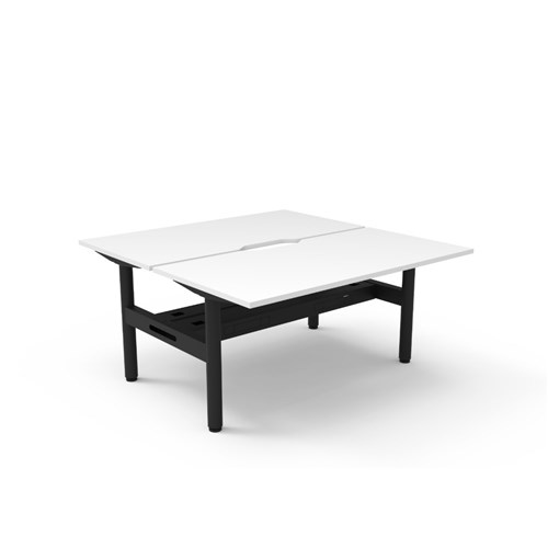 Natural White top Black Satin frame. Double sided workstation with cable tray. Overall Dimensions: 1500mW x 1500D x 730mmH. Per User Dimensions: 1500W x 750D x 730mmH. E0 rated 25mm top with rigid edging and 50mm diameter scallop cut out to rear. Powder coated underframe. Adjustable levelling feet. Can be customised with optional accessories like cable management solutions and privacy screens. 10 Year Manufacturer's Warranty. Delivery, installation and assembly charges may apply to furniture. Please enquire to confirm.