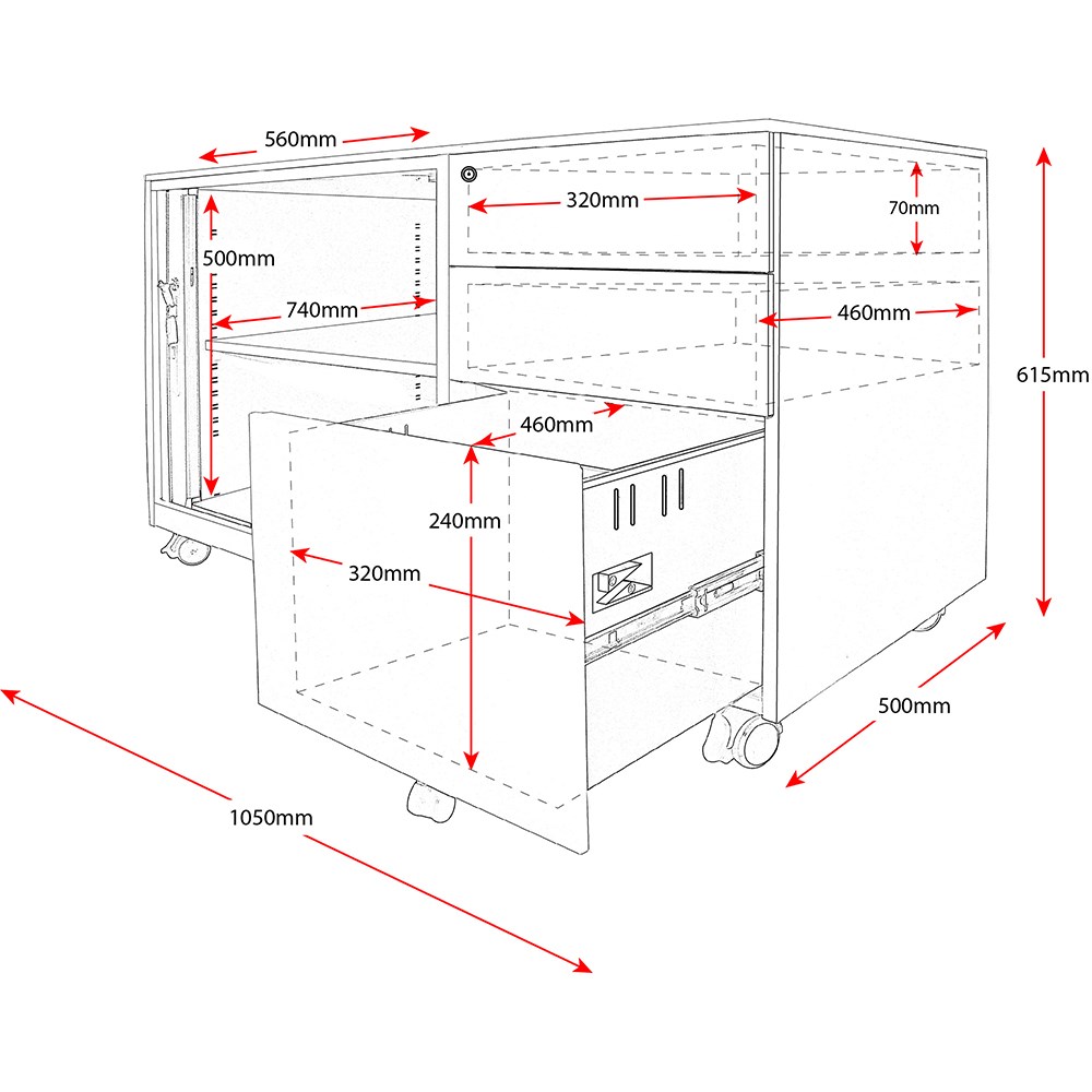 Two personal drawers and one filing drawer, Tambour section with an adjustable shelf. Foolscap size files run front to back in file drawer, A4 size files run side to side in file drawer. Internals: Tambour Size 560W x 740D x 500H, Top two drawers 320W x 460D x 70H, Bottom filing drawer 320W x 460D x 240H. Fully lockable. Flush front mobile pedestal. Ball bearing runners to drawers. Available in right or left sided Tambour door. No assembly required. 10 Year Manufacturer's Warranty. Delivery, installation and assembly charges may apply to furniture. Please enquire to confirm.