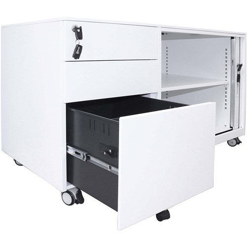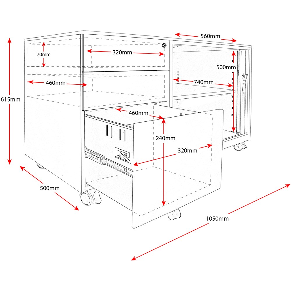 Two personal drawers and one filing drawer, Tambour section with an adjustable shelf. Foolscap size files run front to back in file drawer, A4 size files run side to side in file drawer. Internals: Tambour Size 560W x 740D x 500H, Top two drawers 320W x 460D x 70H, Bottom filing drawer 320W x 460D x 240H. Fully lockable. Flush front mobile pedestal. Ball bearing runners to drawers. Available in right or left sided Tambour door. No assembly required. 10 Year Manufacturer's Warranty. Delivery, installation and assembly charges may apply to furniture. Please enquire to confirm.