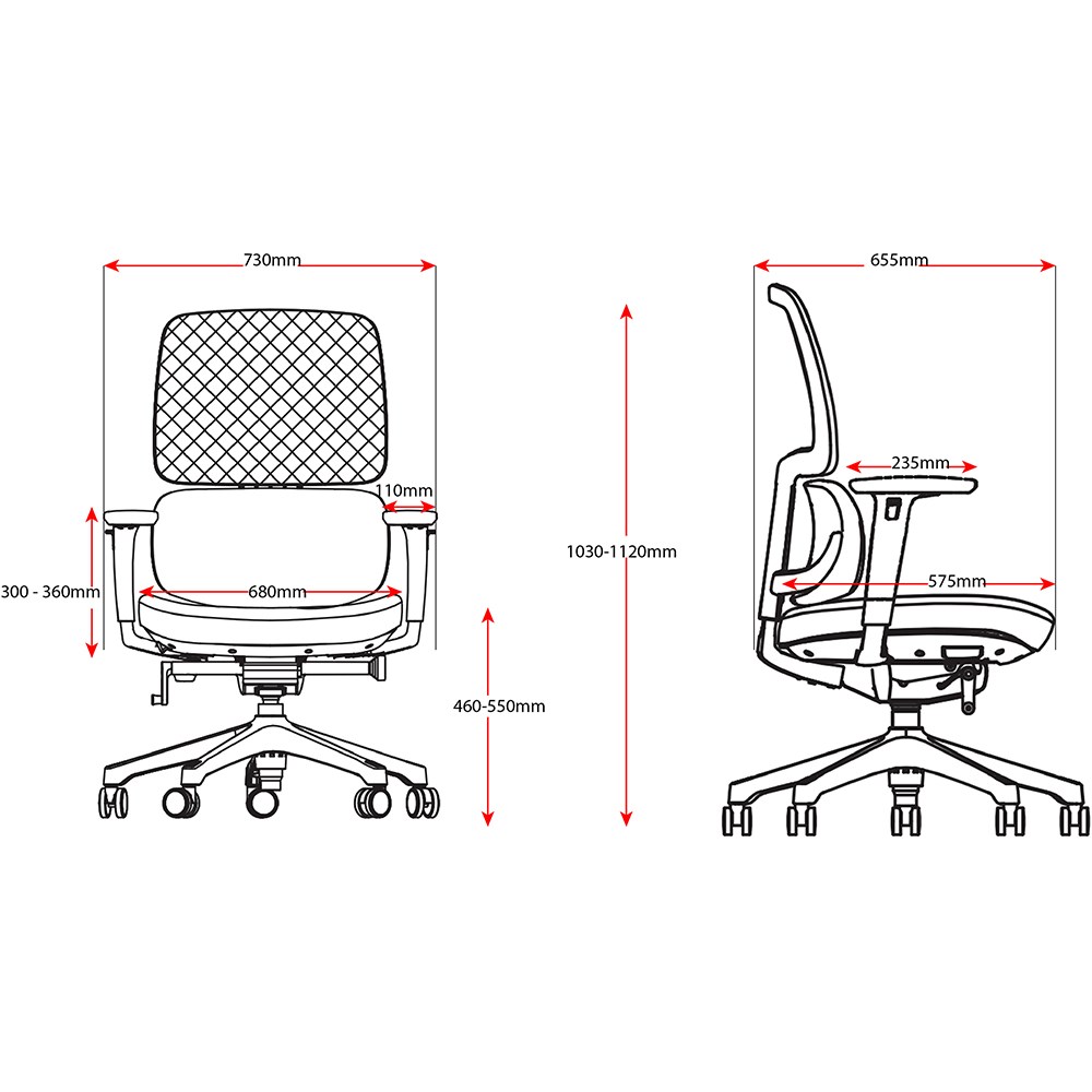 A stylish and ideal chair for any type of work environment. The chair moves with you and has 4 locking positions. Black Korean high elastic mesh back rest and black fabric upholstered seat. 80mm thick moulded foam seat. Ratchet backrest adjustment allowing the lumbar to adjust in dual direction. Lumbar and back rest have a 80mm adjustment stroke. Black 5 star base with black 60/25 PU castors. 135 Kg weight rating. Chair Dimensions: Seat 680W x 575D x Seat 460-550mmH. Overall height: 1030-1120mmH 10 Year Manufacturer's Warranty. Delivery, installation and assembly charges may apply to furniture. Please enquire to confirm.