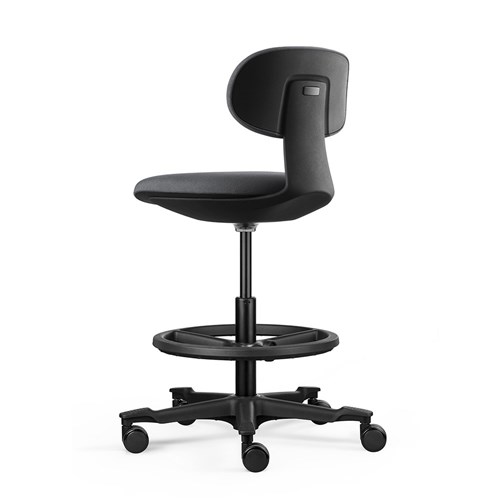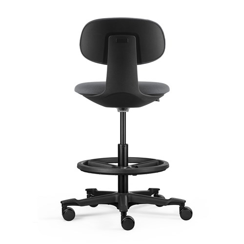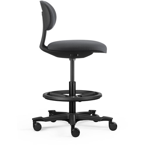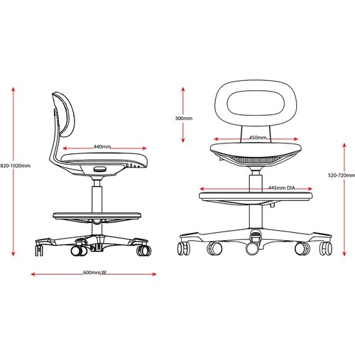 A height-adjustable sit-stand chair. The moulded foam seat and back and the nylon base with castors ensure user comfort and easy mobility. Wire-Control height adjustable mechanism. Castors. Black nylon 5 star base with Top Grip Treads. Curved, ratchet backrest. Greenguard Gold and BIFMA certified. Weight rating 110kg. Black Nylon Drafting Ring - 445mm Diameter. Chair Dimensions: Seat 450W x 440D x Seat 520-720mmH. Overall height: 820-1020mmH. 10 Year Manufacturer's Warranty. Delivery, installation and assembly charges may apply to furniture. Please enquire to confirm.