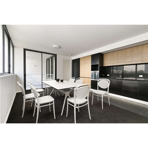 Table Dimensions: 1800W x 800D x 725mmH. Chair Dimensions: 520W x 450D x 850mmH. Seat Height: 440mm. UV stabilised (will not fade) and weather resistant. Chairs are stackable. 150kg weight rating. Seat cushion available. Chairs and table base suitable for indoor and outdoor commercial application. Table tops are suitable for indoor and shaded outdoor commercial application (dark colours not recommended in direct sunlight). Chairs are CATAS tested. Produced in a factory accredited to ISO 14001 and ISO 14064-1:2018 Environmental standard. Recyclable at end of life. Package Includes 8 x Marcel chairs and 1 x Air 180 table. 2 Year Manufacturer's Warranty. Delivery, installation and assembly charges may apply to furniture. Please enquire to confirm.