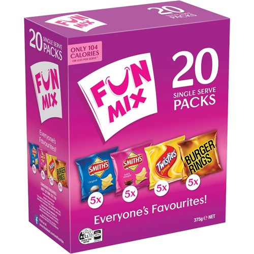 Full of the funniest of Smith's flavours. 5 x Original, 5 x Salt and Vinegar, 5 x Twisties and 5 x Burger Rings. Variety is the spice of life!.